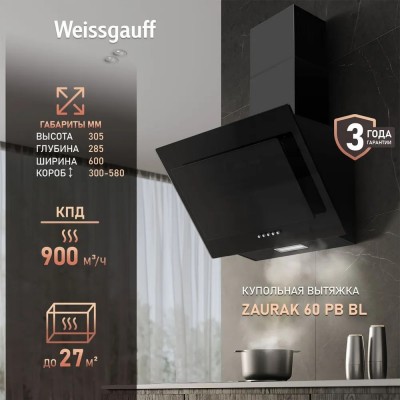 покрытие > бытовая техника > Вытяжка Weissgauff Zaurak 60 PB BL, Производительность 900 м3/ч, 3 скорости, Низкий уровень шума 65 дБ, Режимы отвод и циркуляция, LED освещение, Закаленное стекло