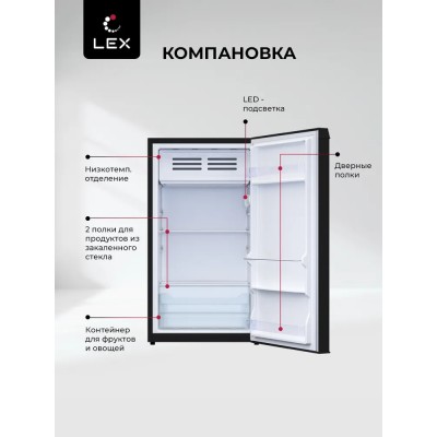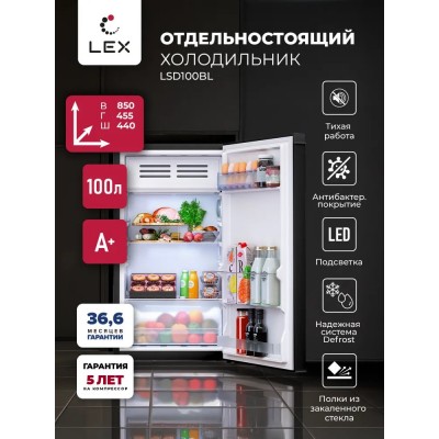 покрытие > бытовая техника > Холодильник отдельностоящий для дома, офиса и дачи, LEX LSD100BL, полезный объем 83л, полки из закаленного стекла, низкотемпературная камера, Defrost,цвет черный