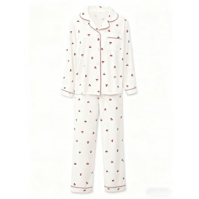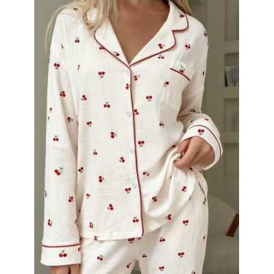 покрытие > Одежда и аксессуары > Женский комплект пижамы красного цвета с длинными рукавами и вишневым принтом - удобный дизайн с вишнями, застежка спереди на пуговицах, воротник-жабо, комфорт круглый год, повседневный стиль, идеально для дома